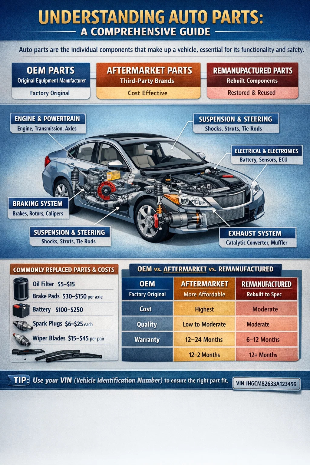 Na najzákladnejšej úrovni spadajú autodiely do dvoch širokých kategórií: OEM (Original Equipment Manufacturer) diely a náhradné diely . OEM diely sú vyrábané originálnym výrobcom vozidla alebo pre neho a sú identické s tým, čo bolo dodané s autom z továrne. Náhradné diely vyrábajú spoločnosti tretích strán a môžu sa líšiť v kvalite, cene a vhodnosti. Tretia kategória – repasované alebo repasované diely – sa týka použitých komponentov, ktoré boli zrekonštruované tak, aby spĺňali pôvodné výkonnostné špecifikácie.